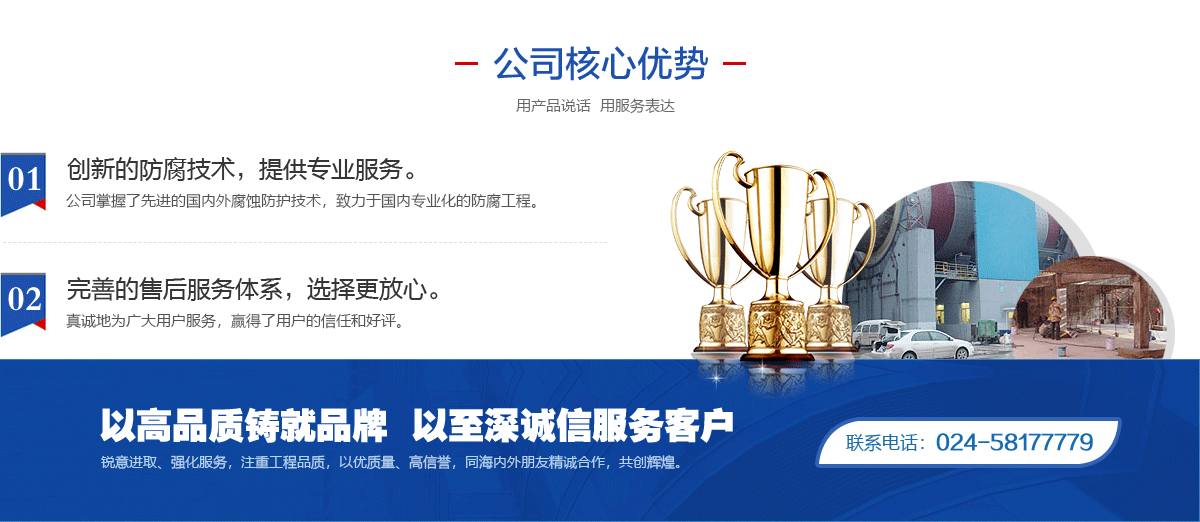 2004;GB/T28001-2011/OHSAS18001:2007;GB/T19001-2008/ISO9001:2008認證 體系,取得了化工防腐蝕施工資質等級一級單位,遼寧省腐蝕與防護學會防腐施工專業(yè)委員 會主任委員會主任委員單位,是中國石油撫順石油化工公司網內成員單位。幾年來本著“客 戶為尊、精益求精”的服務宗旨,服務于基礎設施、石油、化工、治金、化纖、能源、礦山、 核電站、海洋工程等眾多行業(yè)企業(yè)。 ![]() ![]() ![]() ![]() |